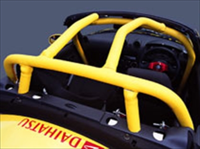 6点式(ダッシュ逃げ)/40φ/肉厚2mm/スチール製(冷間引き抜き継ぎ目無し炭素鋼)を使用した本格的ロールバー。 ボディ剛性を大幅に向上させ、走りの安定感を高めるとともに、転倒などのアクシデントの際、乗員を保護します。 ホワイト塗装済。(写真はロールバーパッド巻き付け状態) アクティブトップ開閉可能。